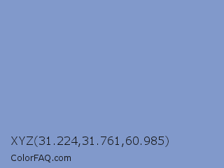 XYZ 31.224,31.761,60.985 Color is a light blue color and the nearest color is Dark Pastel Blue #779ecb. Hex code #8199cb and RGB value is rgb(129,153,203). In RGB color space, this color is composed of 51% red, 60% green, 80% blue, In CMYK color space, this color is composed of 36% cyan, 25% magenta, 0% yellow , 20% black , In HSL color space, this color has a hue angle of 221° , 42% saturation and 65% lightness.