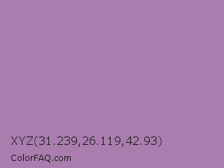 XYZ 31.239,26.119,42.93 Color is a normal magenta color and the nearest color is Bouquet #ae809e. Hex code #a97dad and RGB value is rgb(169,125,173). In RGB color space, this color is composed of 66% red, 49% green, 68% blue, In CMYK color space, this color is composed of 2% cyan, 28% magenta, 0% yellow , 32% black , In HSL color space, this color has a hue angle of 295° , 23% saturation and 58% lightness.