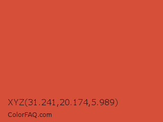XYZ 31.241,20.174,5.989 Color is a normal red color and the nearest color is Valencia #d84437. Hex code #d64f38 and RGB value is rgb(214,79,56). In RGB color space, this color is composed of 84% red, 31% green, 22% blue, In CMYK color space, this color is composed of 0% cyan, 63% magenta, 74% yellow , 16% black , In HSL color space, this color has a hue angle of 9° , 66% saturation and 53% lightness.
