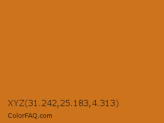 XYZ 31.242,25.183,4.313 Color is a normal orange color and the nearest color is Ochre #cc7722. Hex code #cc731c and RGB value is rgb(204,115,28). In RGB color space, this color is composed of 80% red, 45% green, 11% blue, In CMYK color space, this color is composed of 0% cyan, 44% magenta, 86% yellow , 20% black , In HSL color space, this color has a hue angle of 30° , 76% saturation and 45% lightness.