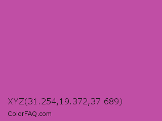 XYZ 31.254,19.372,37.689 Color is a normal magenta color and the nearest color is Mulberry #c54b8c. Hex code #c04ea5 and RGB value is rgb(192,78,165). In RGB color space, this color is composed of 75% red, 31% green, 65% blue, In CMYK color space, this color is composed of 0% cyan, 59% magenta, 14% yellow , 25% black , In HSL color space, this color has a hue angle of 314° , 48% saturation and 53% lightness.