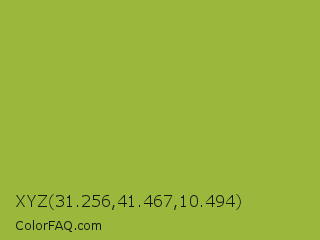 XYZ 31.256,41.467,10.494 Color is a normal lime color and the nearest color is Android Green #a4c639. Hex code #9ab83b and RGB value is rgb(154,184,59). In RGB color space, this color is composed of 60% red, 72% green, 23% blue, In CMYK color space, this color is composed of 16% cyan, 0% magenta, 68% yellow , 28% black , In HSL color space, this color has a hue angle of 74° , 51% saturation and 48% lightness.