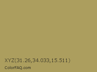 XYZ 31.26,34.033,15.511 Color is a normal yellow color and the nearest color is Teak #b19461. Hex code #ac9e5e and RGB value is rgb(172,158,94). In RGB color space, this color is composed of 67% red, 62% green, 37% blue, In CMYK color space, this color is composed of 0% cyan, 8% magenta, 45% yellow , 33% black , In HSL color space, this color has a hue angle of 49° , 32% saturation and 52% lightness.