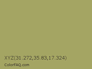 XYZ 31.272,35.83,17.324 Color is a normal yellow color and the nearest color is Green Smoke #a4af6e. Hex code #a5a564 and RGB value is rgb(165,165,100). In RGB color space, this color is composed of 65% red, 65% green, 39% blue, In CMYK color space, this color is composed of 0% cyan, 0% magenta, 39% yellow , 35% black , In HSL color space, this color has a hue angle of 60° , 27% saturation and 52% lightness.