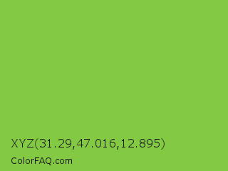 XYZ 31.29,47.016,12.895 Color is a normal green color and the nearest color is Yellow Green #9acd32. Hex code #83c944 and RGB value is rgb(131,201,68). In RGB color space, this color is composed of 51% red, 79% green, 27% blue, In CMYK color space, this color is composed of 35% cyan, 0% magenta, 66% yellow , 21% black , In HSL color space, this color has a hue angle of 92° , 55% saturation and 53% lightness.
