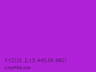 XYZ 31.2,15.445,66.982 Color is a normal purple color and the nearest color is Vivid Mulberry #b80ce3. Hex code #b121d9 and RGB value is rgb(177,33,217). In RGB color space, this color is composed of 69% red, 13% green, 85% blue, In CMYK color space, this color is composed of 18% cyan, 85% magenta, 0% yellow , 15% black , In HSL color space, this color has a hue angle of 287° , 74% saturation and 49% lightness.