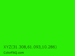 XYZ 31.308,61.093,10.286 Color is a normal green color and the nearest color is Neon Green #39ff14. Hex code #2bed05 and RGB value is rgb(43,237,5). In RGB color space, this color is composed of 17% red, 93% green, 2% blue, In CMYK color space, this color is composed of 82% cyan, 0% magenta, 98% yellow , 7% black , In HSL color space, this color has a hue angle of 110° , 96% saturation and 47% lightness.