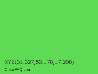 XYZ 31.327,53.178,17.208 Color is a normal green color and the nearest color is Mantis #74c365. Hex code #5eda55 and RGB value is rgb(94,218,85). In RGB color space, this color is composed of 37% red, 85% green, 33% blue, In CMYK color space, this color is composed of 57% cyan, 0% magenta, 61% yellow , 15% black , In HSL color space, this color has a hue angle of 116° , 64% saturation and 59% lightness.