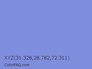XYZ 31.328,28.782,72.311 Color is a light blue color and the nearest color is Chetwode Blue #8581d9. Hex code #7f8ddd and RGB value is rgb(127,141,221). In RGB color space, this color is composed of 50% red, 55% green, 87% blue, In CMYK color space, this color is composed of 43% cyan, 36% magenta, 0% yellow , 13% black , In HSL color space, this color has a hue angle of 231° , 58% saturation and 68% lightness.
