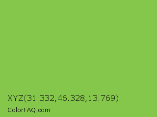 XYZ 31.332,46.328,13.769 Color is a normal green color and the nearest color is Dollar Bill #85bb65. Hex code #85c74a and RGB value is rgb(133,199,74). In RGB color space, this color is composed of 52% red, 78% green, 29% blue, In CMYK color space, this color is composed of 33% cyan, 0% magenta, 63% yellow , 22% black , In HSL color space, this color has a hue angle of 92° , 53% saturation and 54% lightness.