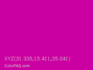 XYZ 31.335,15.411,35.041 Color is a normal magenta color and the nearest color is Red Violet #c71585. Hex code #cc00a1 and RGB value is rgb(204,0,161). In RGB color space, this color is composed of 80% red, 0% green, 63% blue, In CMYK color space, this color is composed of 0% cyan, 100% magenta, 21% yellow , 20% black , In HSL color space, this color has a hue angle of 313° , 100% saturation and 40% lightness.