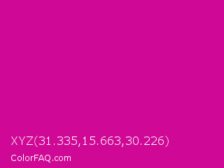 XYZ 31.335,15.663,30.226 Color is a normal magenta color and the nearest color is Red Violet #c71585. Hex code #cf0996 and RGB value is rgb(207,9,150). In RGB color space, this color is composed of 81% red, 4% green, 59% blue, In CMYK color space, this color is composed of 0% cyan, 96% magenta, 28% yellow , 19% black , In HSL color space, this color has a hue angle of 317° , 92% saturation and 42% lightness.