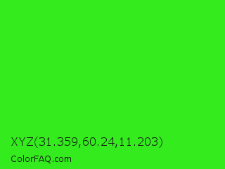 XYZ 31.359,60.24,11.203 Color is a normal green color and the nearest color is Neon Green #39ff14. Hex code #34eb1e and RGB value is rgb(52,235,30). In RGB color space, this color is composed of 20% red, 92% green, 12% blue, In CMYK color space, this color is composed of 78% cyan, 0% magenta, 87% yellow , 8% black , In HSL color space, this color has a hue angle of 114° , 84% saturation and 52% lightness.
