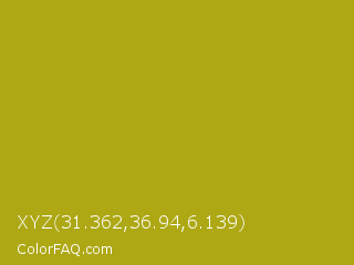 XYZ 31.362,36.94,6.139 Color is a normal yellow color and the nearest color is Sahara #b7a214. Hex code #ada814 and RGB value is rgb(173,168,20). In RGB color space, this color is composed of 68% red, 66% green, 8% blue, In CMYK color space, this color is composed of 0% cyan, 3% magenta, 88% yellow , 32% black , In HSL color space, this color has a hue angle of 58° , 79% saturation and 38% lightness.