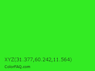 XYZ 31.377,60.242,11.564 Color is a normal green color and the nearest color is Neon Green #39ff14. Hex code #33eb23 and RGB value is rgb(51,235,35). In RGB color space, this color is composed of 20% red, 92% green, 14% blue, In CMYK color space, this color is composed of 78% cyan, 0% magenta, 85% yellow , 8% black , In HSL color space, this color has a hue angle of 115° , 83% saturation and 53% lightness.