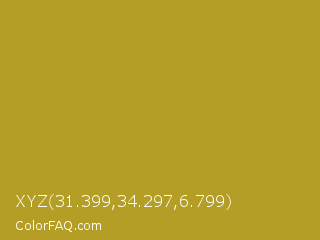 XYZ 31.399,34.297,6.799 Color is a normal yellow color and the nearest color is Lemon Ginger #ac9e22. Hex code #b49e26 and RGB value is rgb(180,158,38). In RGB color space, this color is composed of 71% red, 62% green, 15% blue, In CMYK color space, this color is composed of 0% cyan, 12% magenta, 79% yellow , 29% black , In HSL color space, this color has a hue angle of 51° , 65% saturation and 43% lightness.