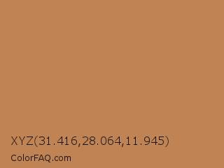 XYZ 31.416,28.064,11.945 Color is a normal orange color and the nearest color is Deer #ba8759. Hex code #c08353 and RGB value is rgb(192,131,83). In RGB color space, this color is composed of 75% red, 51% green, 33% blue, In CMYK color space, this color is composed of 0% cyan, 32% magenta, 57% yellow , 25% black , In HSL color space, this color has a hue angle of 26° , 46% saturation and 54% lightness.