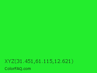 XYZ 31.451,61.115,12.621 Color is a normal green color and the nearest color is Lime Green #32cd32. Hex code #23ed2d and RGB value is rgb(35,237,45). In RGB color space, this color is composed of 14% red, 93% green, 18% blue, In CMYK color space, this color is composed of 85% cyan, 0% magenta, 81% yellow , 7% black , In HSL color space, this color has a hue angle of 123° , 85% saturation and 53% lightness.