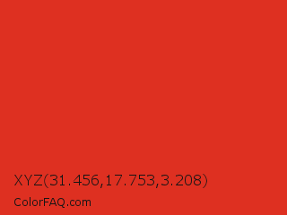 XYZ 31.456,17.753,3.208 Color is a normal red color and the nearest color is Vermilion #d9381e. Hex code #de3021 and RGB value is rgb(222,48,33). In RGB color space, this color is composed of 87% red, 19% green, 13% blue, In CMYK color space, this color is composed of 0% cyan, 78% magenta, 85% yellow , 13% black , In HSL color space, this color has a hue angle of 5° , 74% saturation and 50% lightness.