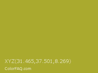 XYZ 31.465,37.501,8.269 Color is a normal yellow color and the nearest color is Lemon Ginger #ac9e22. Hex code #aaaa2f and RGB value is rgb(170,170,47). In RGB color space, this color is composed of 67% red, 67% green, 18% blue, In CMYK color space, this color is composed of 0% cyan, 0% magenta, 72% yellow , 33% black , In HSL color space, this color has a hue angle of 60° , 57% saturation and 43% lightness.