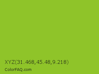 XYZ 31.468,45.48,9.218 Color is a normal green color and the nearest color is Atlantis #97cd2d. Hex code #8fc429 and RGB value is rgb(143,196,41). In RGB color space, this color is composed of 56% red, 77% green, 16% blue, In CMYK color space, this color is composed of 27% cyan, 0% magenta, 79% yellow , 23% black , In HSL color space, this color has a hue angle of 81° , 65% saturation and 46% lightness.