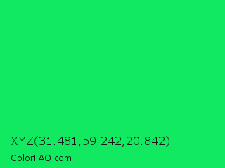 XYZ 31.481,59.242,20.842 Color is a normal green color and the nearest color is Malachite #0bda51. Hex code #11e960 and RGB value is rgb(17,233,96). In RGB color space, this color is composed of 7% red, 91% green, 38% blue, In CMYK color space, this color is composed of 93% cyan, 0% magenta, 59% yellow , 9% black , In HSL color space, this color has a hue angle of 142° , 86% saturation and 49% lightness.