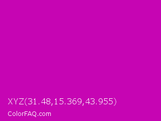 XYZ 31.48,15.369,43.955 Color is a normal magenta color and the nearest color is Deep Magenta #cc00cc. Hex code #c605b3 and RGB value is rgb(198,5,179). In RGB color space, this color is composed of 78% red, 2% green, 70% blue, In CMYK color space, this color is composed of 0% cyan, 97% magenta, 10% yellow , 22% black , In HSL color space, this color has a hue angle of 306° , 95% saturation and 40% lightness.