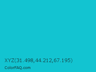 XYZ 31.498,44.212,67.195 Color is a normal cyan color and the nearest color is Turquoise Surf #00c5cd. Hex code #12c4d1 and RGB value is rgb(18,196,209). In RGB color space, this color is composed of 7% red, 77% green, 82% blue, In CMYK color space, this color is composed of 91% cyan, 6% magenta, 0% yellow , 18% black , In HSL color space, this color has a hue angle of 184° , 84% saturation and 45% lightness.