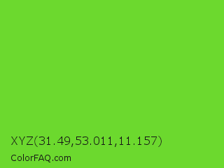 XYZ 31.49,53.011,11.157 Color is a normal green color and the nearest color is Lima #76bd17. Hex code #6cd92e and RGB value is rgb(108,217,46). In RGB color space, this color is composed of 42% red, 85% green, 18% blue, In CMYK color space, this color is composed of 50% cyan, 0% magenta, 79% yellow , 15% black , In HSL color space, this color has a hue angle of 98° , 69% saturation and 52% lightness.