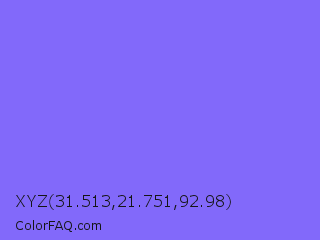 XYZ 31.513,21.751,92.98 Color is a light indigo color and the nearest color is Medium Slate Blue #7b68ee. Hex code #8269fa and RGB value is rgb(130,105,250). In RGB color space, this color is composed of 51% red, 41% green, 98% blue, In CMYK color space, this color is composed of 48% cyan, 58% magenta, 0% yellow , 2% black , In HSL color space, this color has a hue angle of 250° , 94% saturation and 70% lightness.
