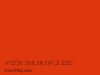 XYZ 31.516,18.197,2.232 Color is a normal red color and the nearest color is Vermilion #d9381e. Hex code #de360d and RGB value is rgb(222,54,13). In RGB color space, this color is composed of 87% red, 21% green, 5% blue, In CMYK color space, this color is composed of 0% cyan, 76% magenta, 94% yellow , 13% black , In HSL color space, this color has a hue angle of 12° , 89% saturation and 46% lightness.