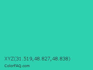 XYZ 31.519,48.827,48.838 Color is a normal cyan color and the nearest color is Maximum Blue Green #30bfbf. Hex code #2ed0b0 and RGB value is rgb(46,208,176). In RGB color space, this color is composed of 18% red, 82% green, 69% blue, In CMYK color space, this color is composed of 78% cyan, 0% magenta, 15% yellow , 18% black , In HSL color space, this color has a hue angle of 168° , 64% saturation and 50% lightness.