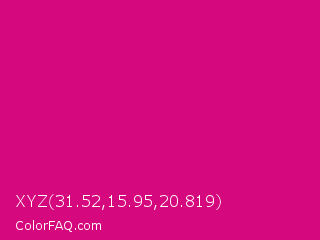 XYZ 31.52,15.95,20.819 Color is a normal magenta color and the nearest color is Mexican Pink #e4007c. Hex code #d6087d and RGB value is rgb(214,8,125). In RGB color space, this color is composed of 84% red, 3% green, 49% blue, In CMYK color space, this color is composed of 0% cyan, 96% magenta, 42% yellow , 16% black , In HSL color space, this color has a hue angle of 326° , 93% saturation and 44% lightness.