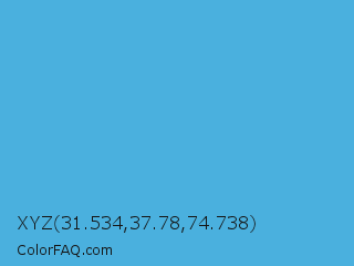 XYZ 31.534,37.78,74.738 Color is a normal blue color and the nearest color is Picton Blue #45b1e8. Hex code #4ab0de and RGB value is rgb(74,176,222). In RGB color space, this color is composed of 29% red, 69% green, 87% blue, In CMYK color space, this color is composed of 67% cyan, 21% magenta, 0% yellow , 13% black , In HSL color space, this color has a hue angle of 199° , 69% saturation and 58% lightness.