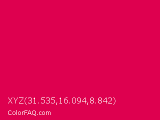 XYZ 31.535,16.094,8.842 Color is a normal rose color and the nearest color is UA Red #d9004c. Hex code #de004f and RGB value is rgb(222,0,79). In RGB color space, this color is composed of 87% red, 0% green, 31% blue, In CMYK color space, this color is composed of 0% cyan, 100% magenta, 64% yellow , 13% black , In HSL color space, this color has a hue angle of 339° , 100% saturation and 44% lightness.