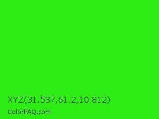 XYZ 31.537,61.2,10.812 Color is a normal green color and the nearest color is Neon Green #39ff14. Hex code #2eed14 and RGB value is rgb(46,237,20). In RGB color space, this color is composed of 18% red, 93% green, 8% blue, In CMYK color space, this color is composed of 81% cyan, 0% magenta, 92% yellow , 7% black , In HSL color space, this color has a hue angle of 113° , 86% saturation and 50% lightness.
