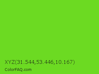 XYZ 31.544,53.446,10.167 Color is a normal green color and the nearest color is Lima #76bd17. Hex code #6cda22 and RGB value is rgb(108,218,34). In RGB color space, this color is composed of 42% red, 85% green, 13% blue, In CMYK color space, this color is composed of 50% cyan, 0% magenta, 84% yellow , 15% black , In HSL color space, this color has a hue angle of 96° , 73% saturation and 49% lightness.
