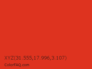 XYZ 31.555,17.996,3.107 Color is a normal red color and the nearest color is Vermilion #d9381e. Hex code #de331f and RGB value is rgb(222,51,31). In RGB color space, this color is composed of 87% red, 20% green, 12% blue, In CMYK color space, this color is composed of 0% cyan, 77% magenta, 86% yellow , 13% black , In HSL color space, this color has a hue angle of 6° , 75% saturation and 50% lightness.