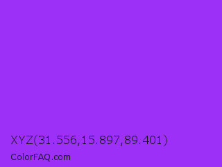 XYZ 31.556,15.897,89.401 Color is a normal purple color and the nearest color is Veronica #a020f0. Hex code #9c30f7 and RGB value is rgb(156,48,247). In RGB color space, this color is composed of 61% red, 19% green, 97% blue, In CMYK color space, this color is composed of 37% cyan, 81% magenta, 0% yellow , 3% black , In HSL color space, this color has a hue angle of 273° , 93% saturation and 58% lightness.