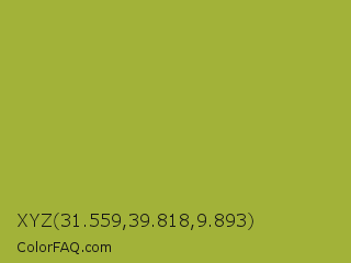 XYZ 31.559,39.818,9.893 Color is a normal yellow color and the nearest color is Android Green #a4c639. Hex code #a2b239 and RGB value is rgb(162,178,57). In RGB color space, this color is composed of 64% red, 70% green, 22% blue, In CMYK color space, this color is composed of 9% cyan, 0% magenta, 68% yellow , 30% black , In HSL color space, this color has a hue angle of 68° , 51% saturation and 46% lightness.