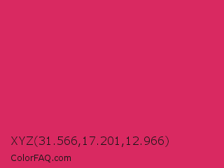 XYZ 31.566,17.201,12.966 Color is a normal rose color and the nearest color is Cerise Red #de3163. Hex code #d92961 and RGB value is rgb(217,41,97). In RGB color space, this color is composed of 85% red, 16% green, 38% blue, In CMYK color space, this color is composed of 0% cyan, 81% magenta, 55% yellow , 15% black , In HSL color space, this color has a hue angle of 341° , 70% saturation and 51% lightness.