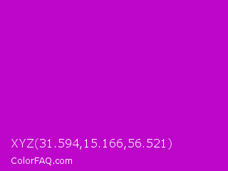 XYZ 31.594,15.166,56.521 Color is a normal magenta color and the nearest color is Deep Magenta #cc00cc. Hex code #bd06c9 and RGB value is rgb(189,6,201). In RGB color space, this color is composed of 74% red, 2% green, 79% blue, In CMYK color space, this color is composed of 6% cyan, 97% magenta, 0% yellow , 21% black , In HSL color space, this color has a hue angle of 296° , 94% saturation and 41% lightness.