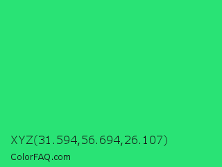 XYZ 31.594,56.694,26.107 Color is a normal green color and the nearest color is UFO Green #3cd070. Hex code #29e375 and RGB value is rgb(41,227,117). In RGB color space, this color is composed of 16% red, 89% green, 46% blue, In CMYK color space, this color is composed of 82% cyan, 0% magenta, 48% yellow , 11% black , In HSL color space, this color has a hue angle of 145° , 77% saturation and 53% lightness.