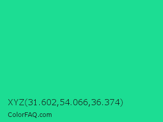 XYZ 31.602,54.066,36.374 Color is a normal green color and the nearest color is Shamrock #33cc99. Hex code #1cdd93 and RGB value is rgb(28,221,147). In RGB color space, this color is composed of 11% red, 87% green, 58% blue, In CMYK color space, this color is composed of 87% cyan, 0% magenta, 33% yellow , 13% black , In HSL color space, this color has a hue angle of 157° , 78% saturation and 49% lightness.