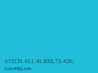 XYZ 31.611,41.833,73.426 Color is a normal cyan color and the nearest color is Scooter #2ebfd4. Hex code #21bddb and RGB value is rgb(33,189,219). In RGB color space, this color is composed of 13% red, 74% green, 86% blue, In CMYK color space, this color is composed of 85% cyan, 14% magenta, 0% yellow , 14% black , In HSL color space, this color has a hue angle of 190° , 74% saturation and 49% lightness.