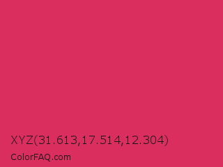 XYZ 31.613,17.514,12.304 Color is a normal rose color and the nearest color is Cerise Red #de3163. Hex code #d92e5e and RGB value is rgb(217,46,94). In RGB color space, this color is composed of 85% red, 18% green, 37% blue, In CMYK color space, this color is composed of 0% cyan, 79% magenta, 57% yellow , 15% black , In HSL color space, this color has a hue angle of 343° , 69% saturation and 52% lightness.