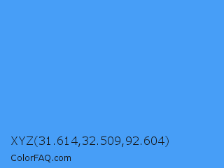 XYZ 31.614,32.509,92.604 Color is a light blue color and the nearest color is Brilliant Azure #3399ff. Hex code #479ef7 and RGB value is rgb(71,158,247). In RGB color space, this color is composed of 28% red, 62% green, 97% blue, In CMYK color space, this color is composed of 71% cyan, 36% magenta, 0% yellow , 3% black , In HSL color space, this color has a hue angle of 210° , 92% saturation and 62% lightness.