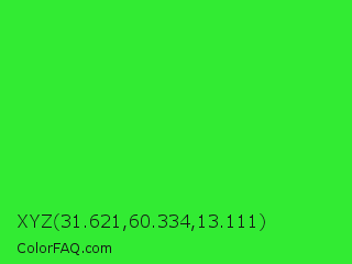 XYZ 31.621,60.334,13.111 Color is a normal green color and the nearest color is Lime Green #32cd32. Hex code #32eb33 and RGB value is rgb(50,235,51). In RGB color space, this color is composed of 20% red, 92% green, 20% blue, In CMYK color space, this color is composed of 79% cyan, 0% magenta, 78% yellow , 8% black , In HSL color space, this color has a hue angle of 120° , 82% saturation and 56% lightness.