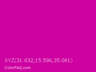 XYZ 31.632,15.596,35.061 Color is a normal magenta color and the nearest color is Red Violet #c71585. Hex code #cd02a1 and RGB value is rgb(205,2,161). In RGB color space, this color is composed of 80% red, 1% green, 63% blue, In CMYK color space, this color is composed of 0% cyan, 99% magenta, 21% yellow , 20% black , In HSL color space, this color has a hue angle of 313° , 98% saturation and 41% lightness.