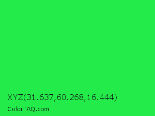 XYZ 31.637,60.268,16.444 Color is a normal green color and the nearest color is Malachite #0bda51. Hex code #23eb4a and RGB value is rgb(35,235,74). In RGB color space, this color is composed of 14% red, 92% green, 29% blue, In CMYK color space, this color is composed of 85% cyan, 0% magenta, 69% yellow , 8% black , In HSL color space, this color has a hue angle of 132° , 83% saturation and 53% lightness.